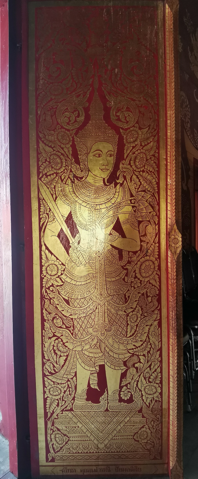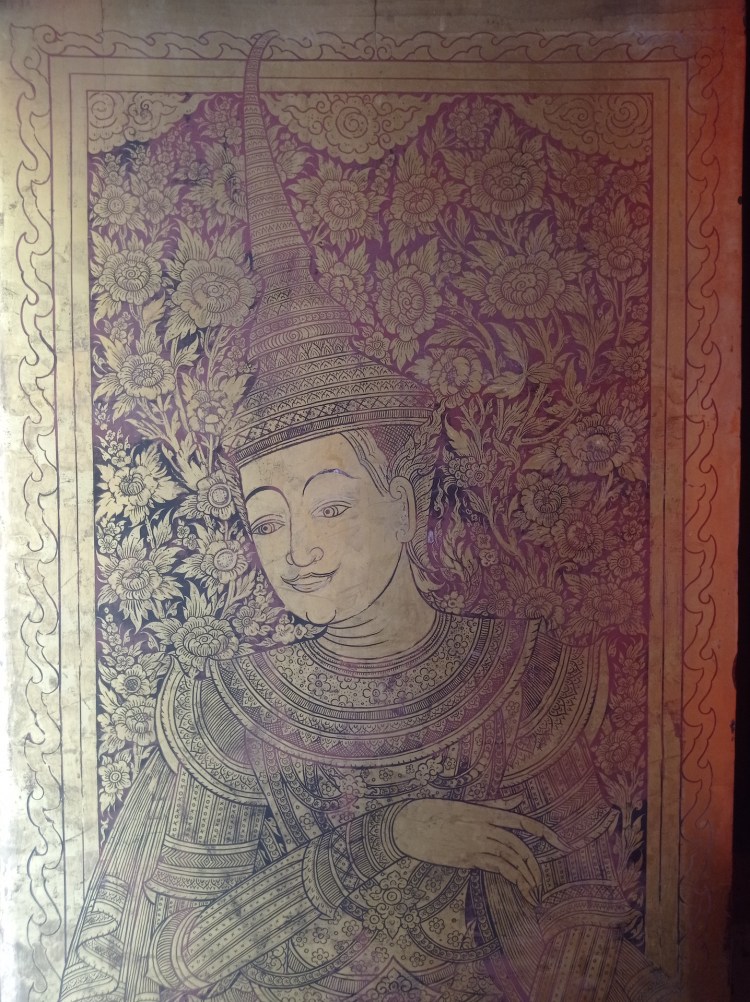 Lors de la lecture de notre article sur Bangkok, vous aviez pu admirer les plantes de pieds du Bouddha couché. Celles-ci étaient ornées de 108 images en nacre, représentant les 108 caractéristiques du Bouddha. Dans ce temple-ci, nous pouvons voir une peinture des plantes de pieds de Bouddha, mais elles sont décorées différemment. En effet, ce tableau montre « les pieds aux mille rayons » décorés également de 108 dessins, mais illustrant cette fois-ci les trois sphères du bouddhisme: le royaume des désirs, le royaume de la matière subtile et le royaume de l’immatériel.