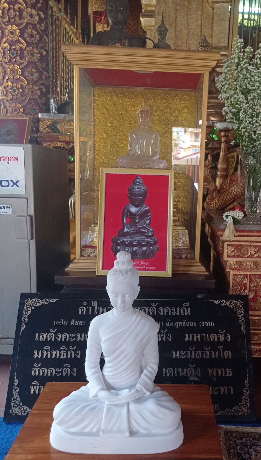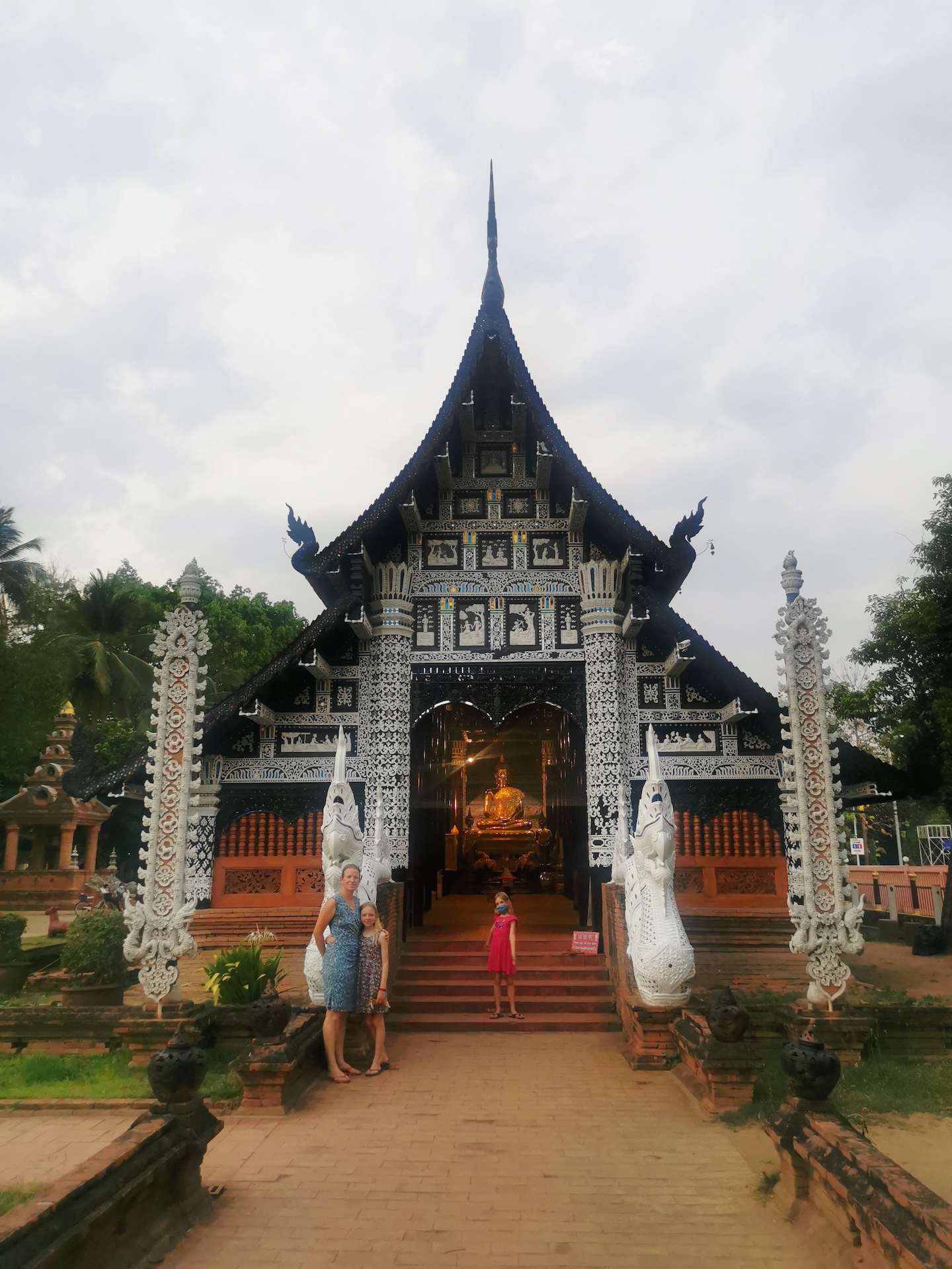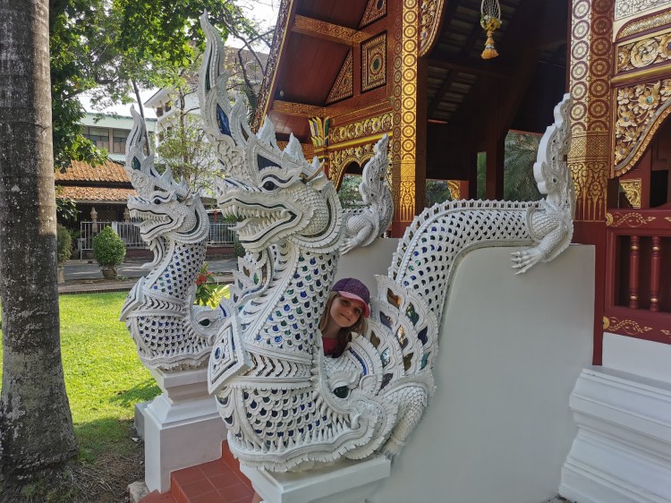 Notre étape suivante nous mène au Wat Chiang Man, temple construit entre 1296 et 1297 AD et considéré comme le plus vieux temple de Chiang Mai. Nous pouvons y admirer une statue du Bouddha en crystal (quartz blanc) datant d’il y a 1500 ans et une statue en marbre blanc, datant d’il y a 2’500 ans. Les statues sont considérées comme étant présentes dans ce temple depuis sa fondation. Nous partons à la recherche de ces deux fameuses statues, mais on peine vraiment! Nous finissons par trouver le Bouddha de crystal, sous une cloche en verre, sur un autel lui même protégé! Par contre, nous n’avons pas trouvé celui en marbre blanc…il devait être encore mieux caché 🤦🏼♀️🤦🏼♂️ ! Nous en avons vu un autre blanc alors on a pris celui-là en photo 😂 !