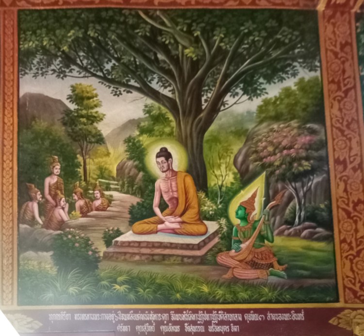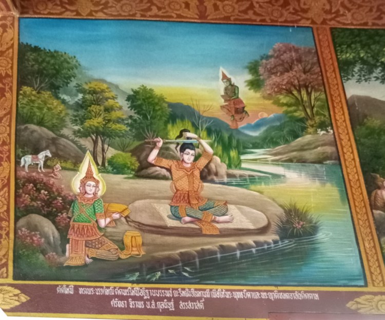 Durant les visites de tous ces temples, nous avons pu admirer des peintures très anciennes, fort bien rénovées ou neuves. A chaque fois elles représentent des étapes de la vie de Bouddha et nous commençons petit à petit à les reconnaître et à mieux comprendre leurs significations. Nous constatons également qu’il ne faut jamais s’asseoir avec les pieds en direction de Bouddha, car les pieds sont la partie la plus « impure » du corps humain. C’est aussi la raison pour laquelle nous devons systématiquement laisser nos shlaps avant d’entrer dans les temples qui abritent des représentations de Bouddha.