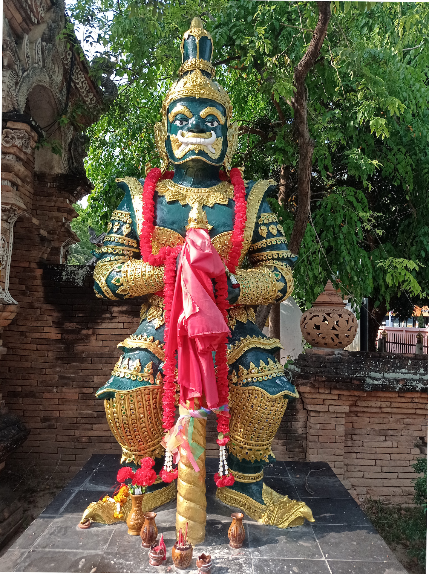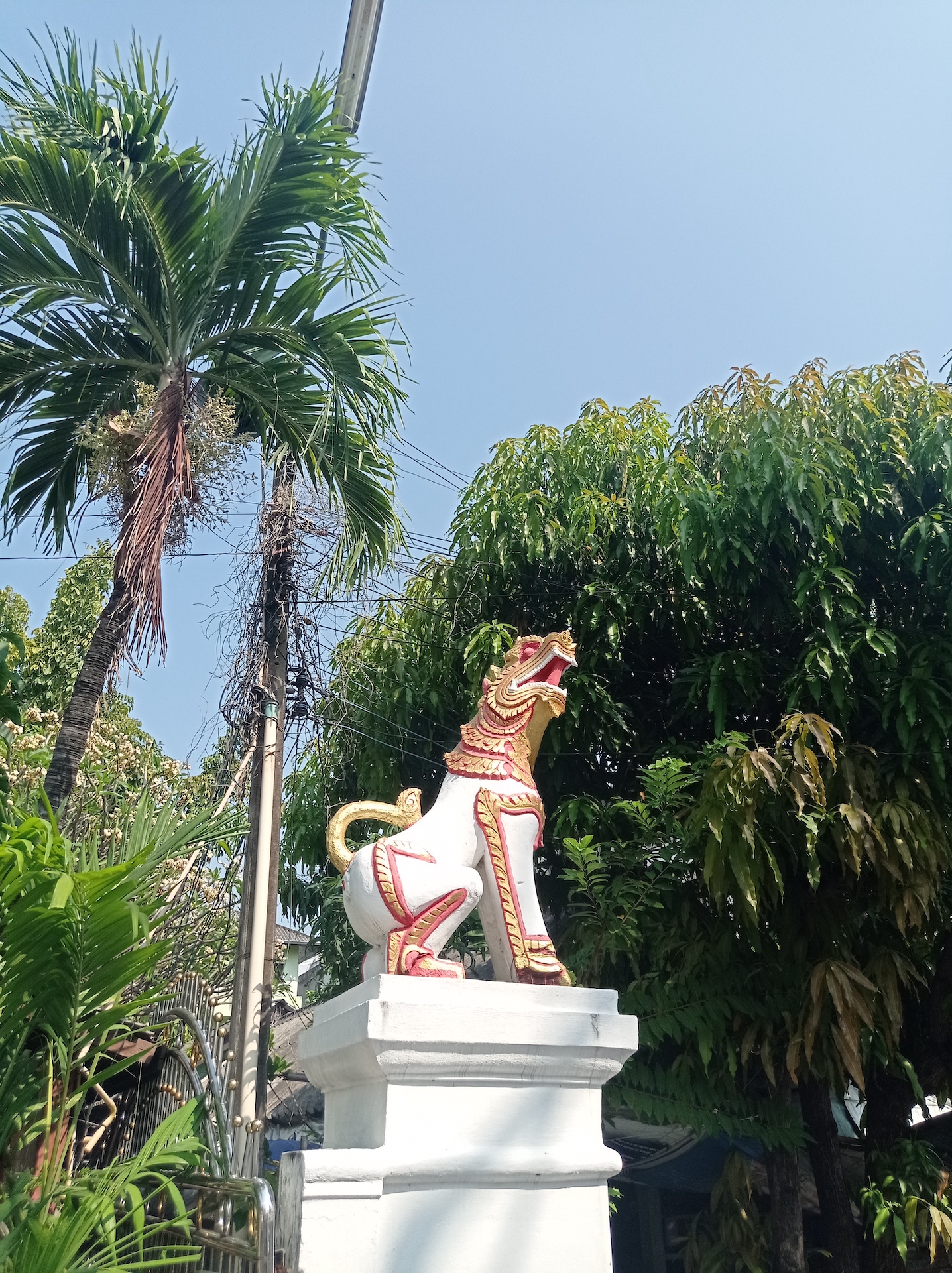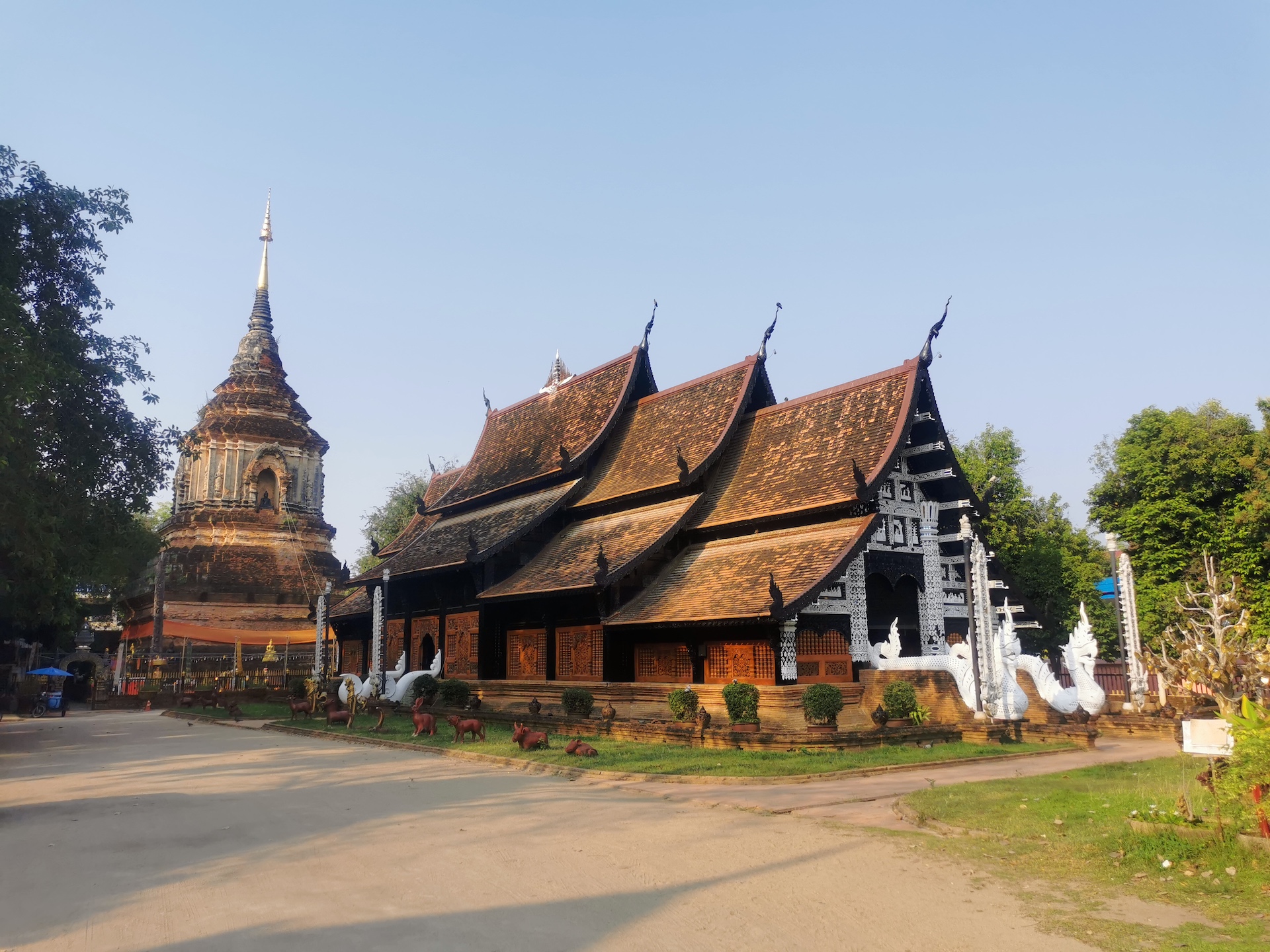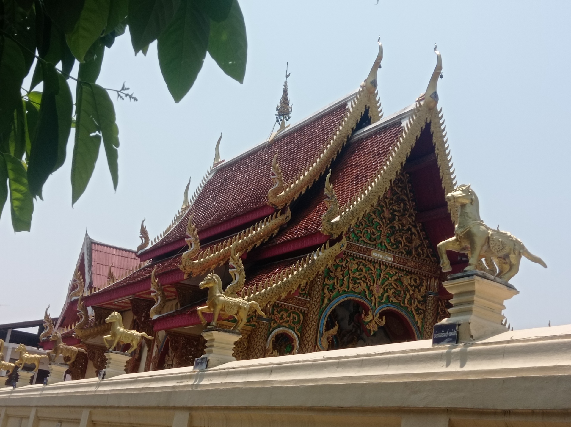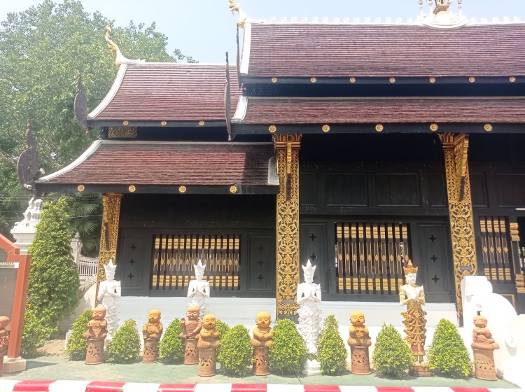 Nous commençons par le Wat Khuan Khama, construit en 1492. Le temple est décoré de beaucoup de statues de chevaux car le jardin appartenait jadis à un écuyer qui en a fait don au temple à la mort de son fidèle compagnon.
