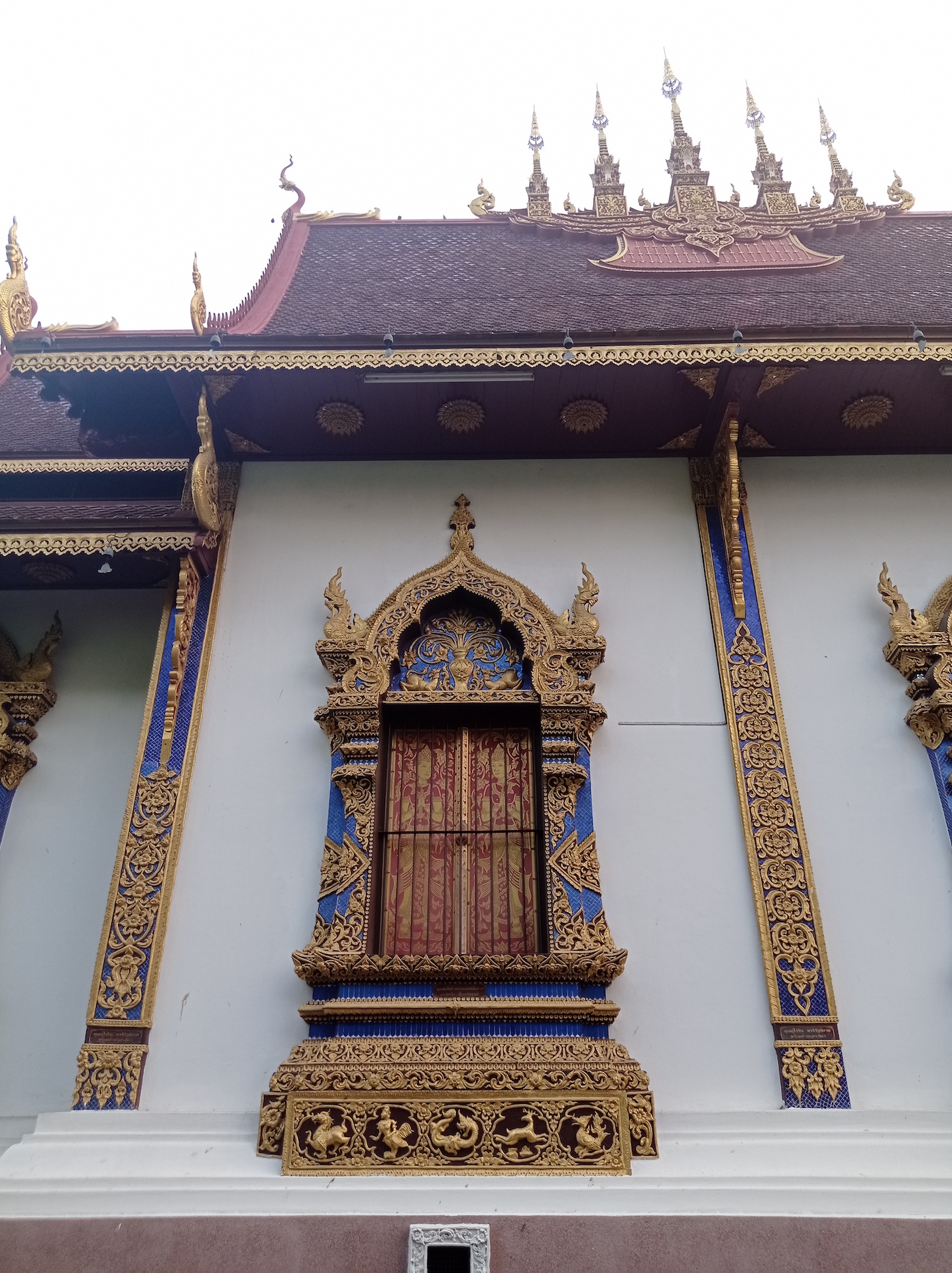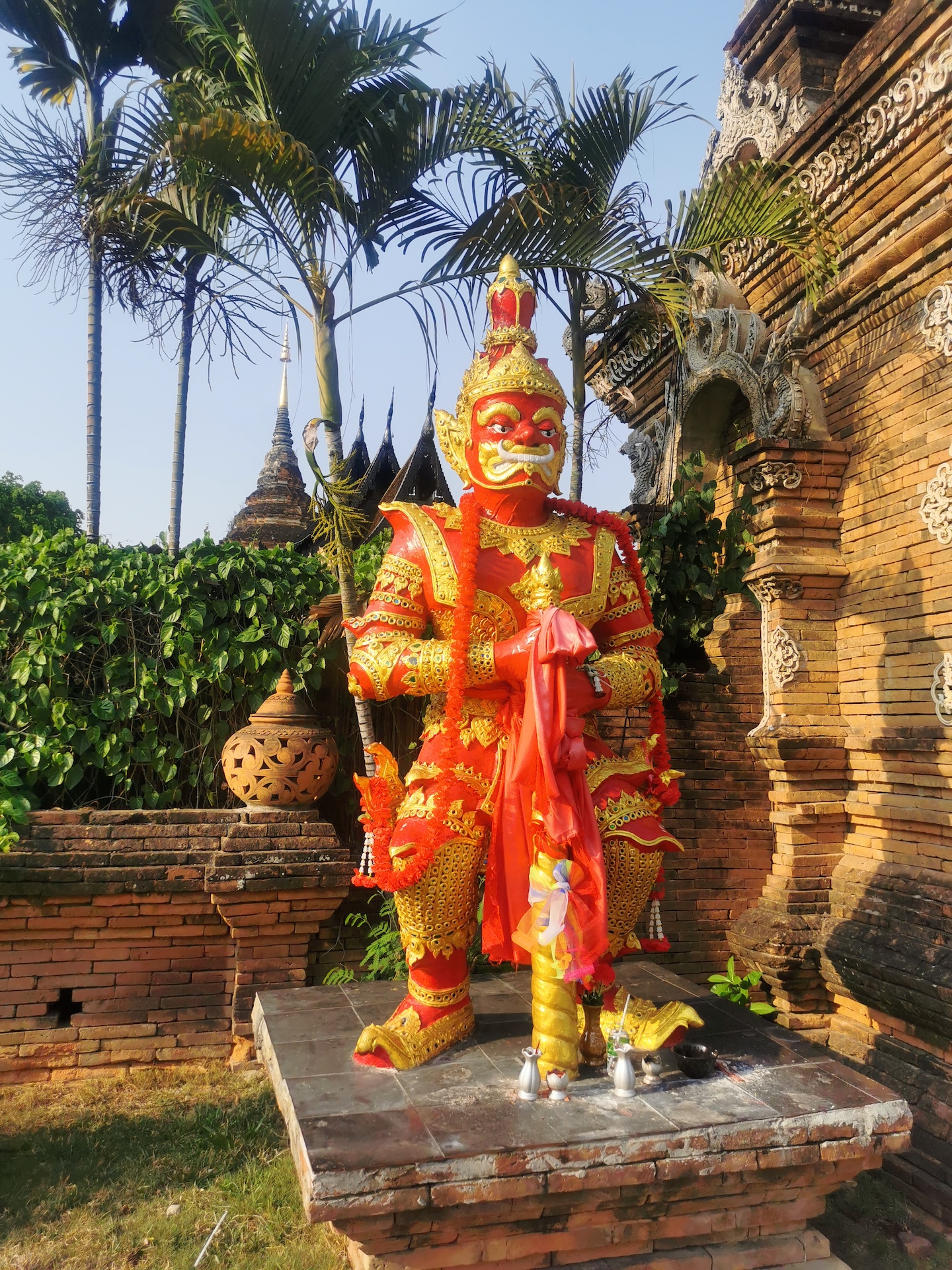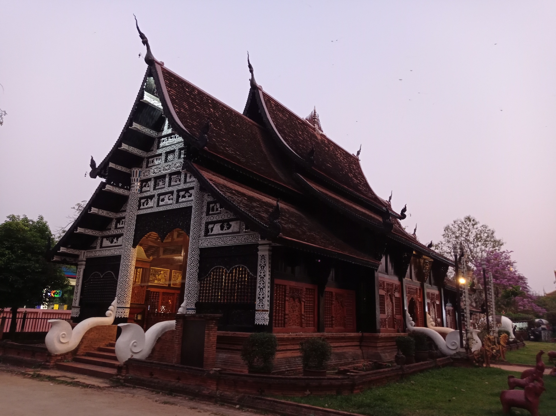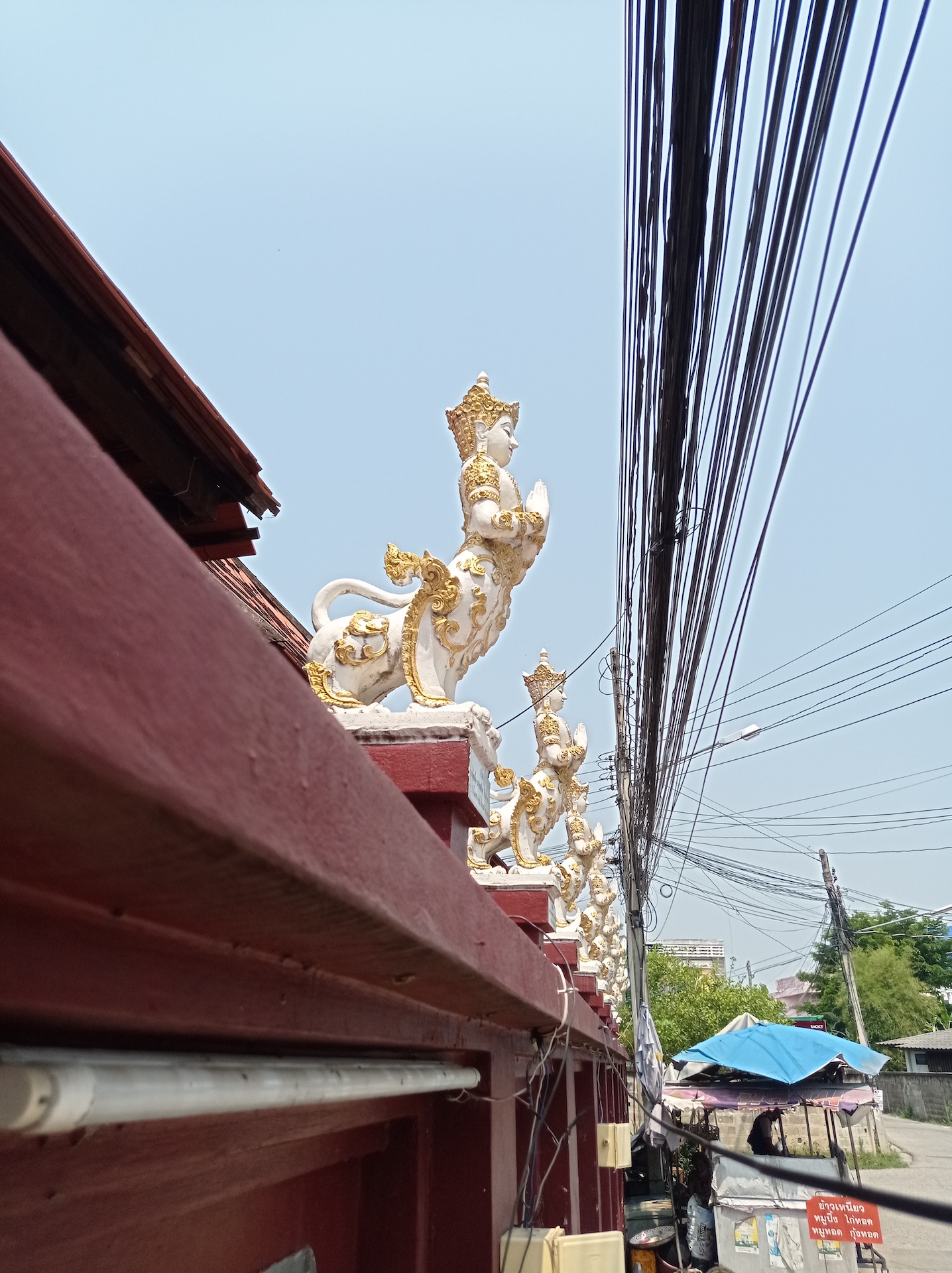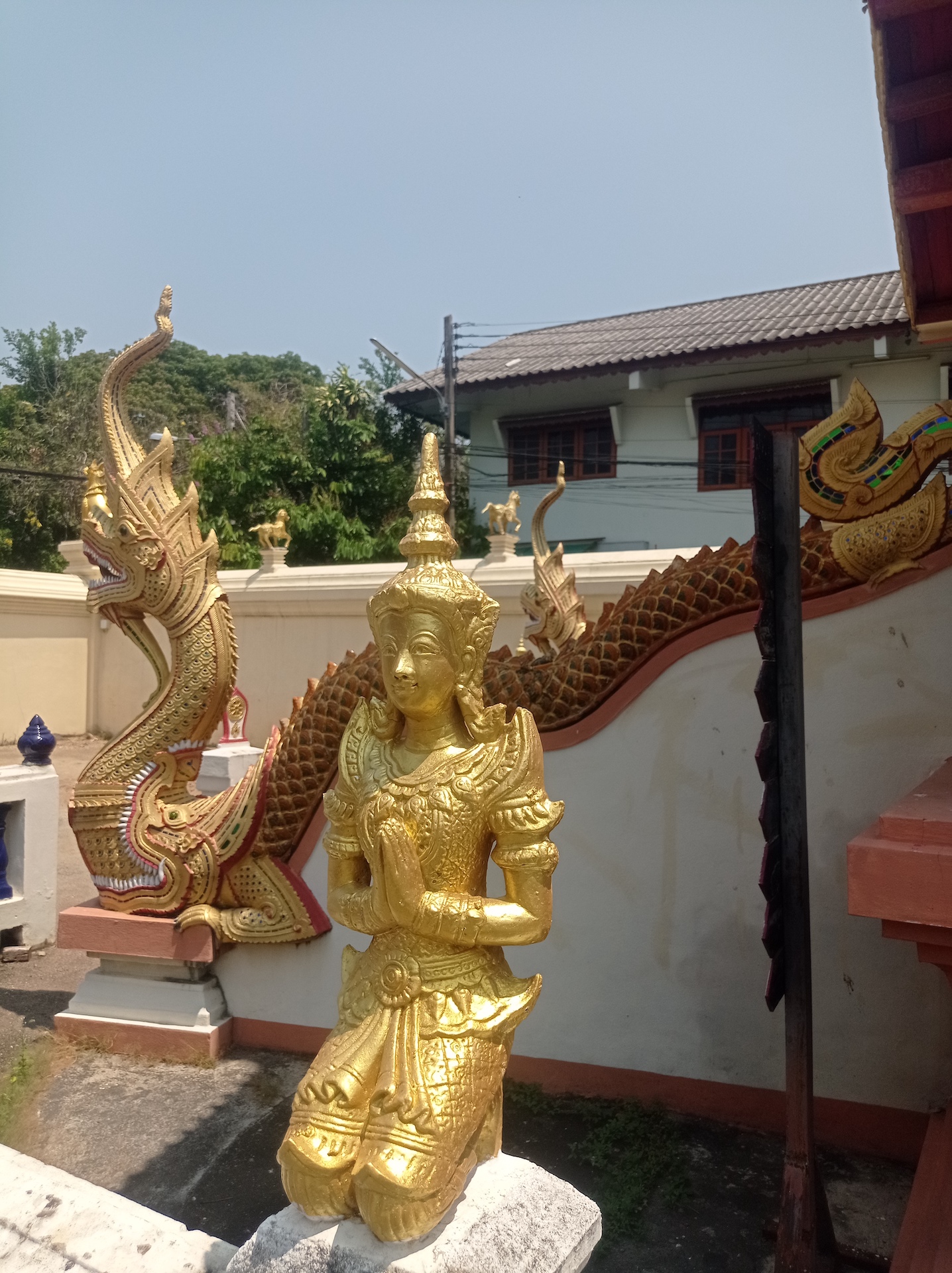 Nous commençons par le Wat Khuan Khama, construit en 1492. Le temple est décoré de beaucoup de statues de chevaux car le jardin appartenait jadis à un écuyer qui en a fait don au temple à la mort de son fidèle compagnon.