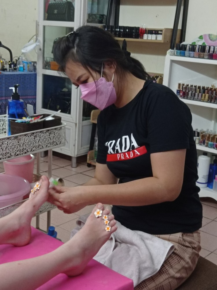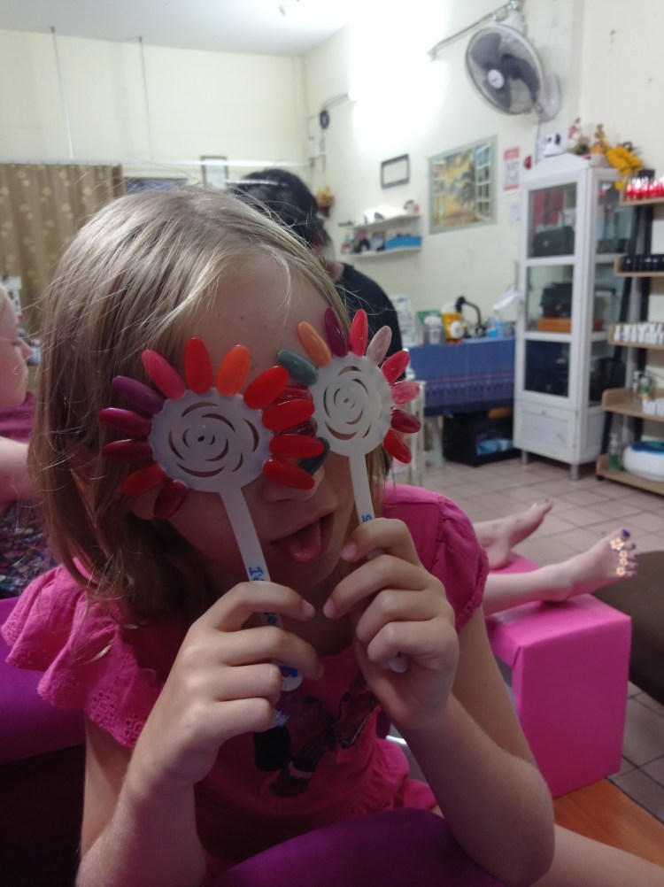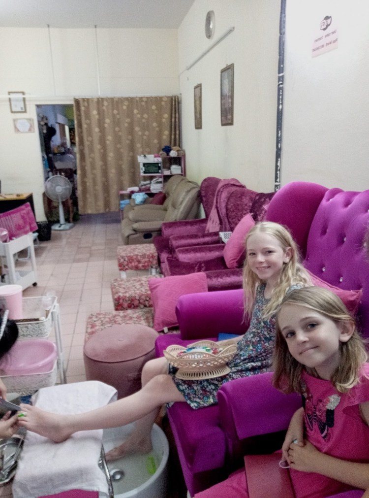 Après ces visites, nous rentrons à notre hôtel. Gabrielle et les deux filles partent se faire chouchouter, mais Philippe préfère rester à l’hôtel 🤪😉. Les filles souhaitent une manucure et pédicure depuis notre arrivée en Thaïlande et comme c’est très, très bon marché ici, pourquoi s’en priver 😀?