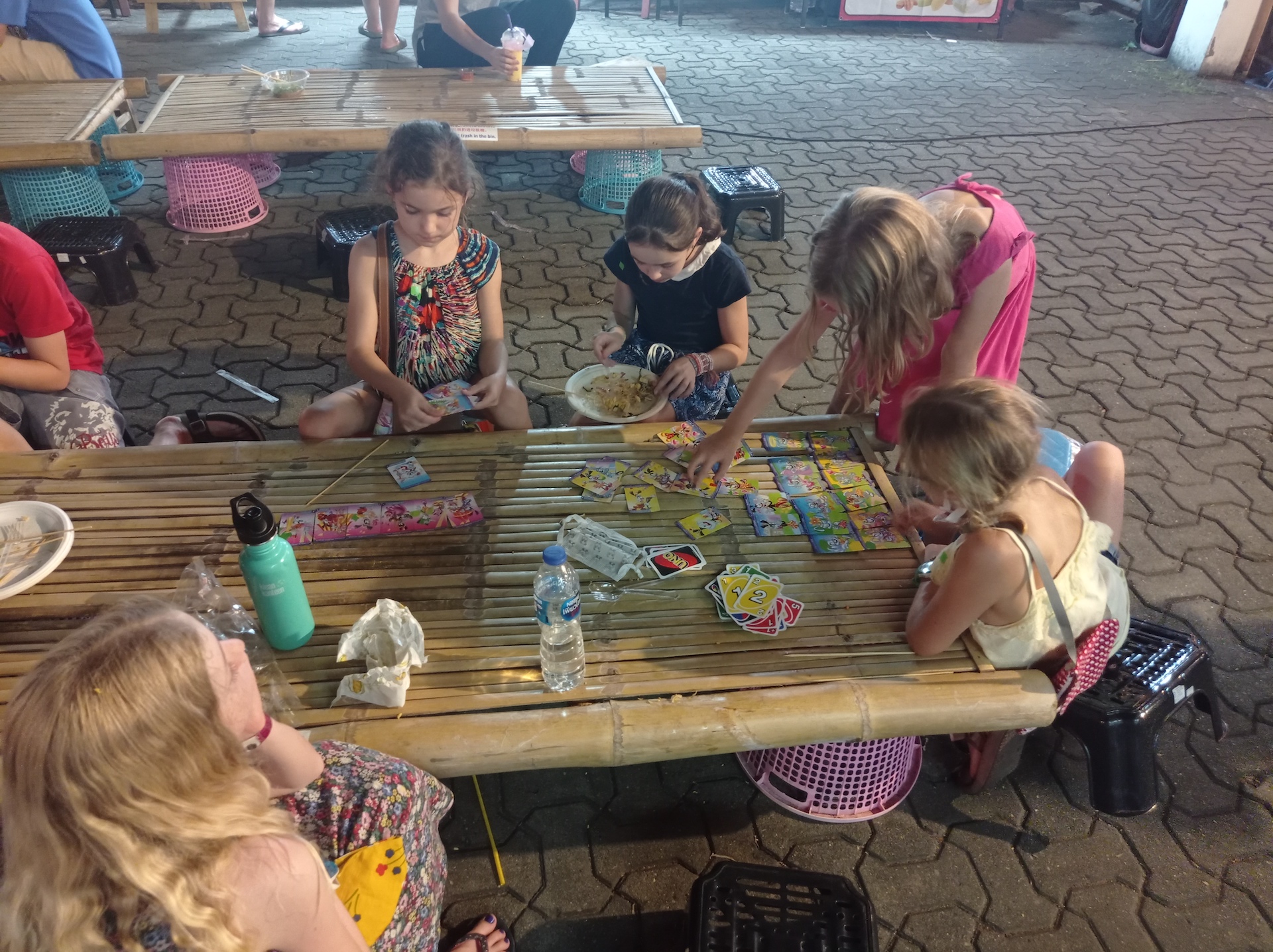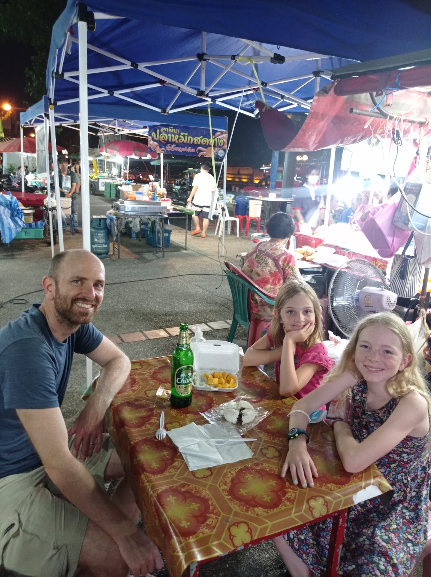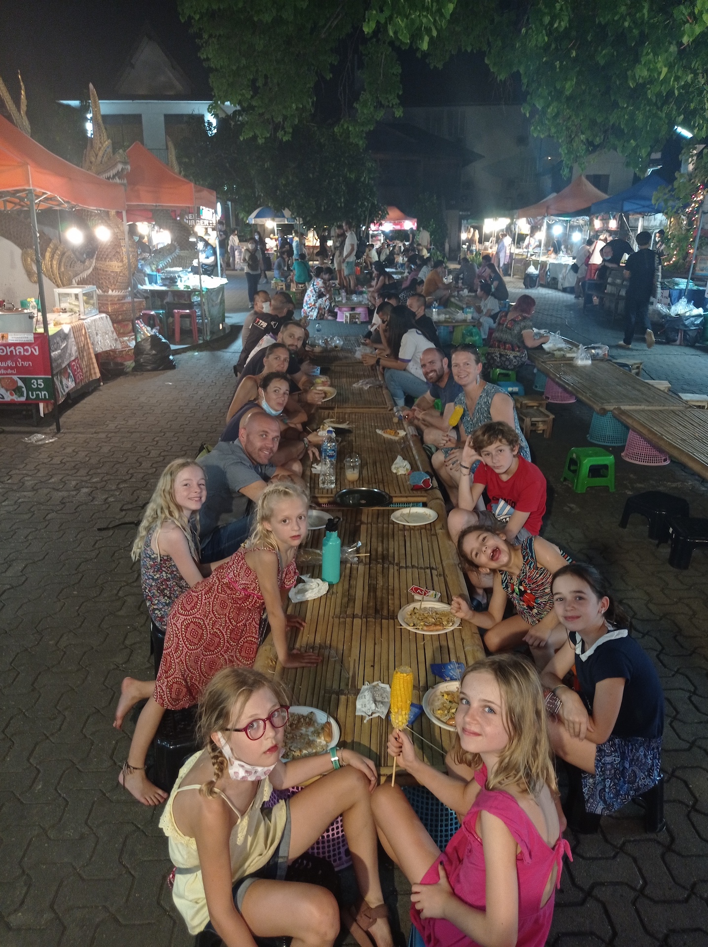 Le soir, nous partons manger à un très grand night market, en plein centre de la vieille ville. Il est spécialement grand car nous sommes dimanche. En chemin, nous croisons une famille rencontrée à Baan Mama, Pierre et Marie, avec leurs filles Zoé et Capucine. Ils se rendent également au marché de nuit et ils ont rendez vous à 19:00 avec une autre famille du Baan Mama, Manon et Xavier, avec leurs trois enfants, Jules, Valentine et Louise. Nous allons donc nous joindre à eux pour le souper 😃.