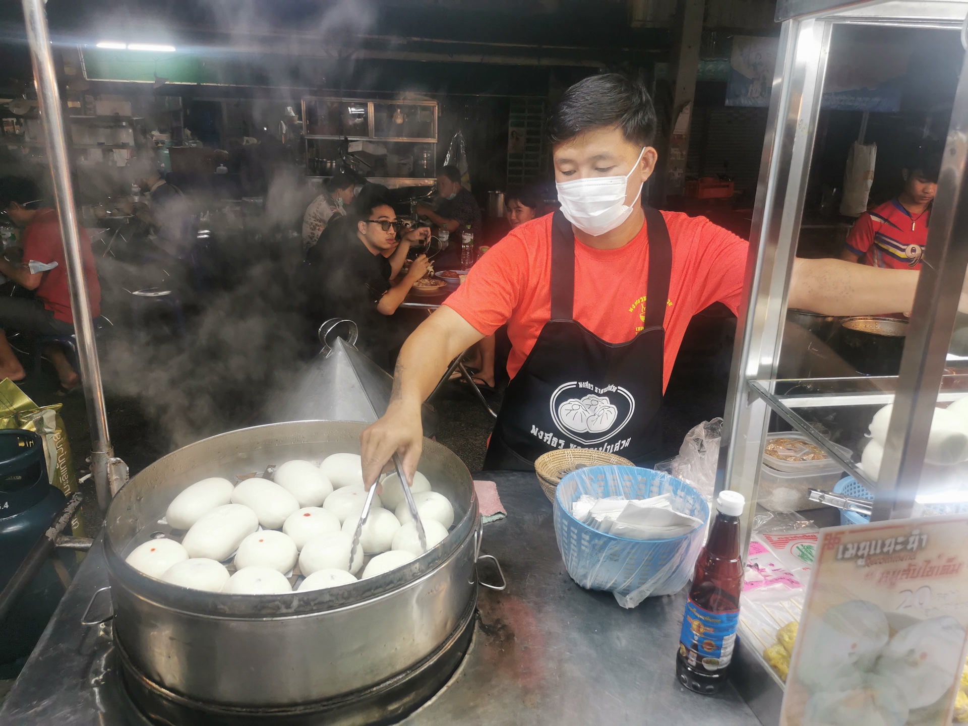 Le soir, nous mangeons à notre premier marché de nuit: petites échoppes montées en début de soirée où chaque stand vend des plats typiques thaïs. Nous y mangeons notre premier mango sticky rice (riz collant avec du lait de coco tiède, servi avec des morceaux de mangues et garni de graines de sésame). Un régal qui sera suivi de beaucoup d’autres 😋 ! Nous y trouvons aussi des petits pains fourrés, cuits à la vapeur. Nous les appelons des baos, mais ce n’est sûrement pas leur vrai nom en Thaïlande🙃. Ils ont une farce soit salée soit sucrée. Notre préféré est celui rempli avec une pâte de haricots noirs.