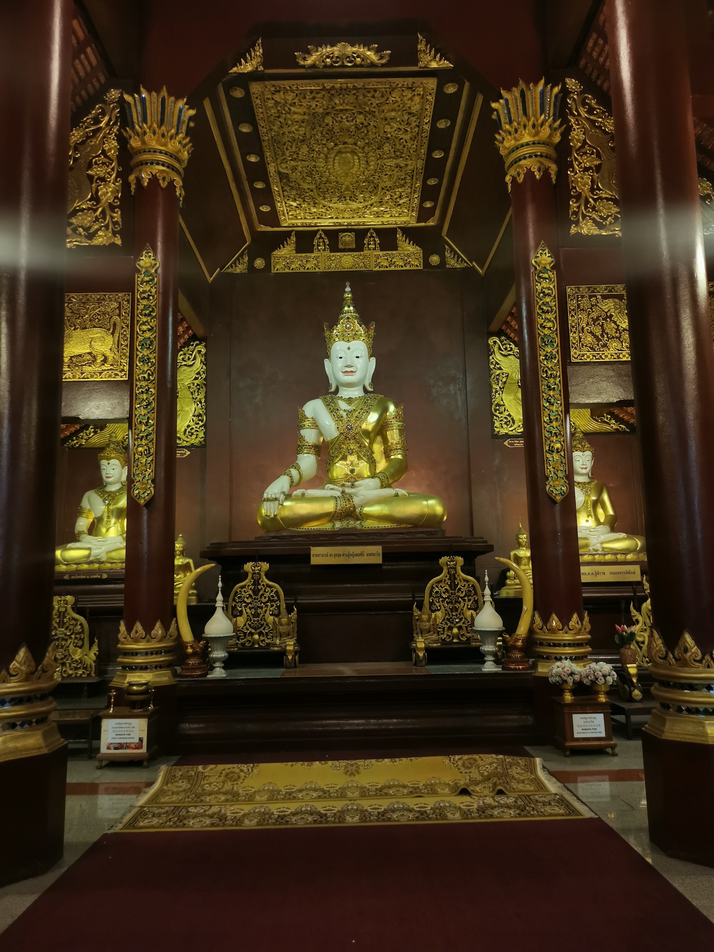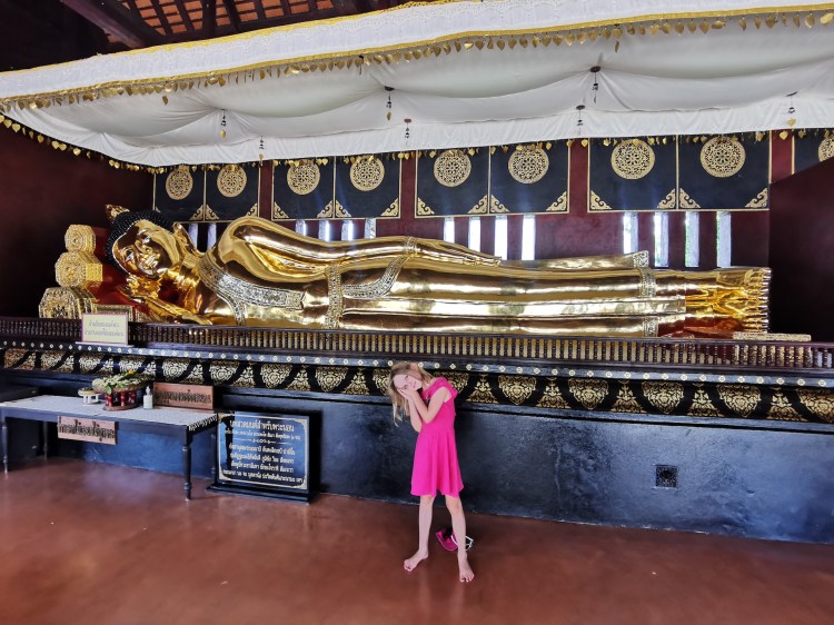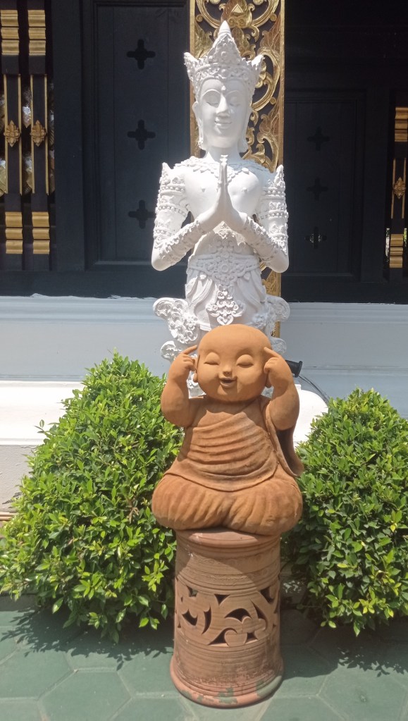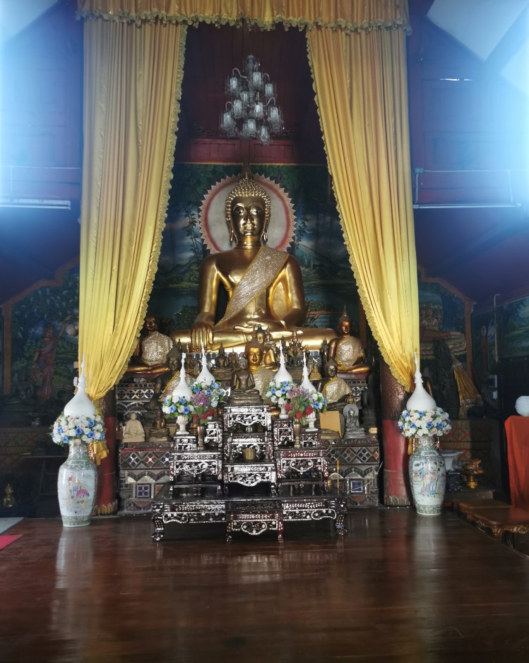 Durant la visite des trois temples suivants, Wat Mo Kham Thuang, Wat Inthakhin Sadue Muang et Wat Phantao, nous décidons de regarder sur Wikipédia la signification des différentes positions de Bouddha sur les statues car nous le voyons toujours dans une de ces trois positions: debout, assis ou couché.
