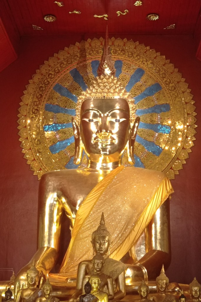 Nous commençons par le site du Wihan Phra Mongkhon Bophit où nous pouvons admirer le plus grand Bouddha en bronze du pays. Il mesure 10m x 12m et daterait du 15ème siècle. Cette statue a par la suite été recouverte de feuilles d’or. Elle a été retrouvée dans les ruines de la ville suite à l’attaque d’Ayutthaya par les Birmans en 1767 puis restaurée pour lui redonner sa splendeur. Lors de cette attaque, la grande majorité de la ville a été pillée et rasée par les envahisseurs. Si la statue se trouvait auparavant à l’air libre, elle est dorénavant à l’abri.