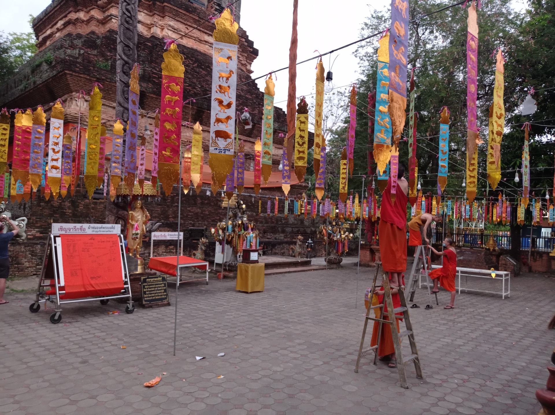 Les nombreux drapeaux sont en train d’être installés par des jeunes moines pour la célébration du nouvel an bouddhiste qui approche à grand pas