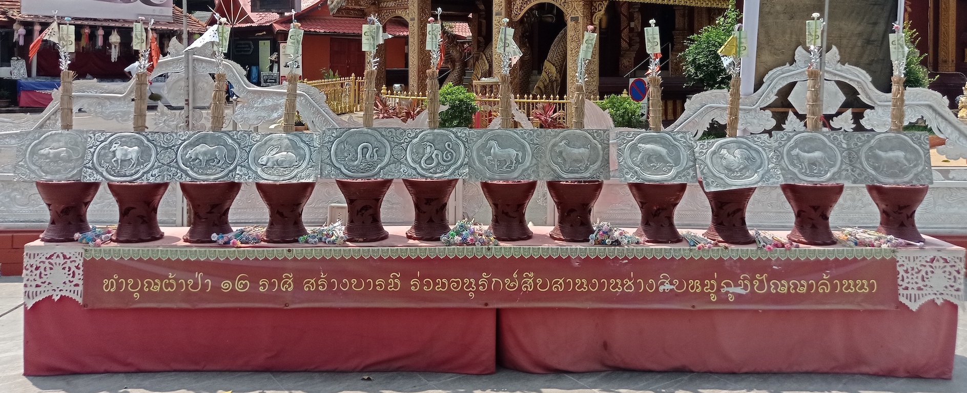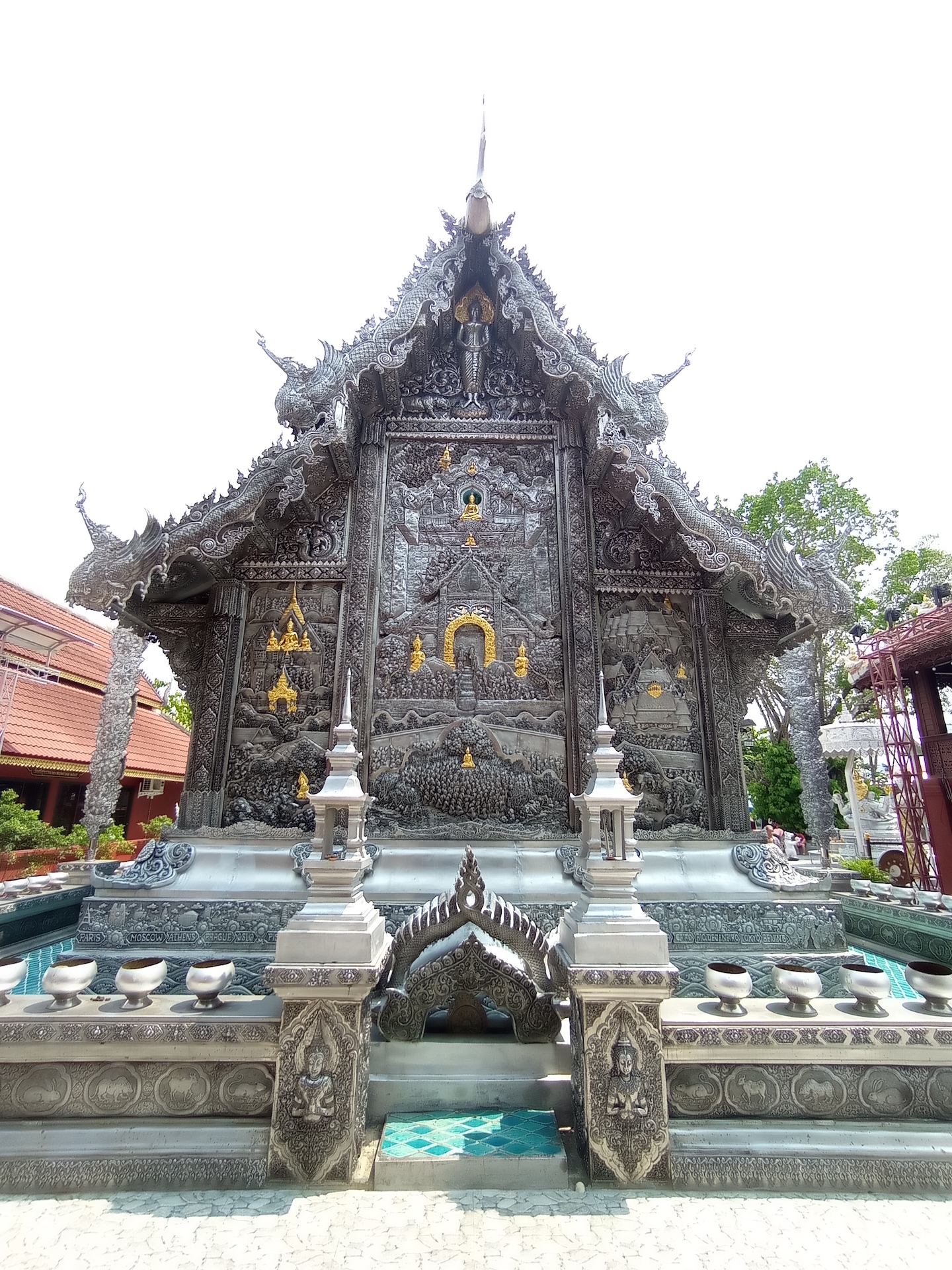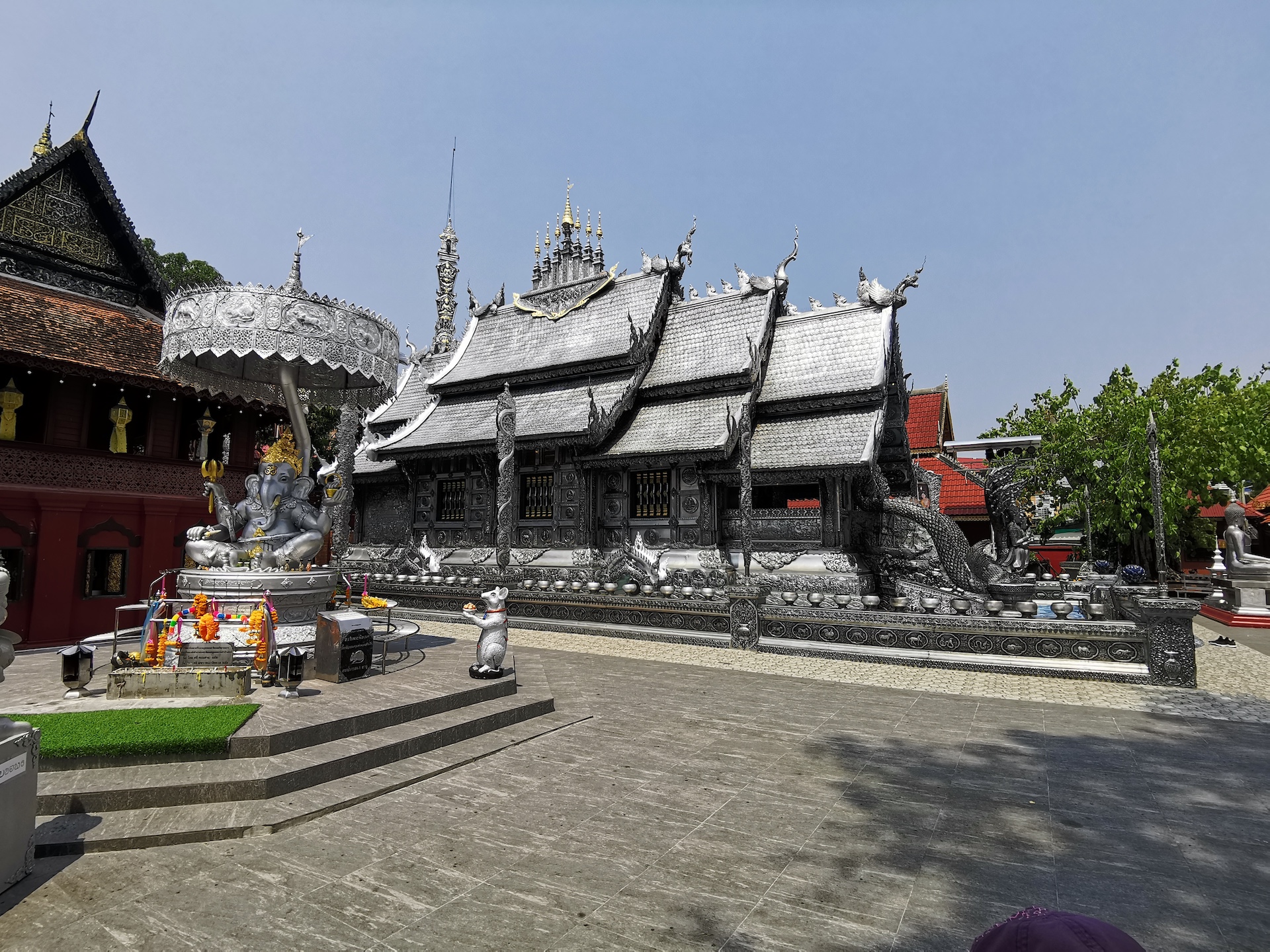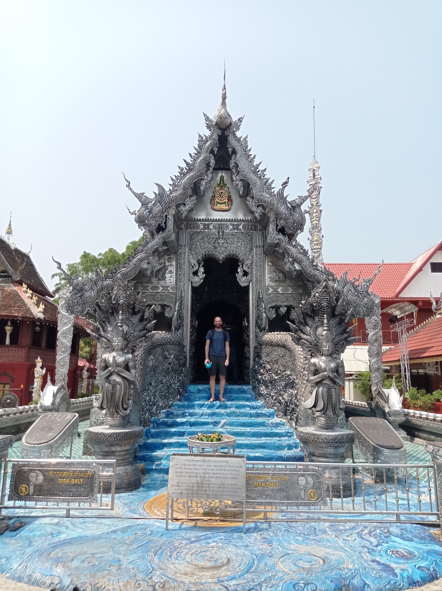 L’unique temple du jour est très spécial: il est presque entièrement recouvert d’argent, et le reste est en nickel ou en aluminium. Tout ce qui est considéré comme saint est en argent. Les fresques représentant la vie de Bouddha sont donc en argent, c’est très beau! Ce temple a été construit en 1500… mais il n’est pas mentionné AD ou BE, donc au Xe ou XVIe siècle, à vous de choisir! 🙃 Malheureusement, seul Philippe est autorisé à entrer dans le bâtiment principal. Les filles doivent se contenter de l’observer depuis l’extérieur et attendre que Philippe revienne avec des images filmées de l’intérieur pour l’admirer.