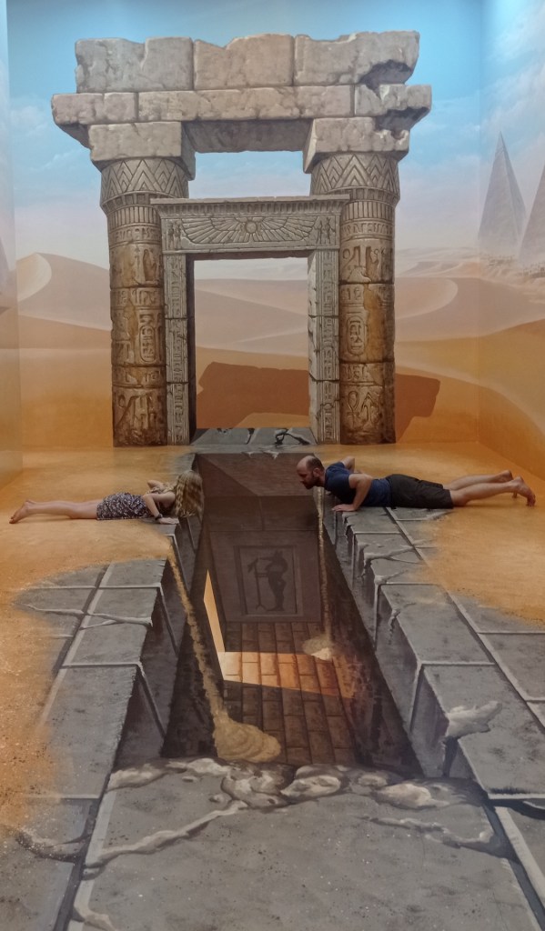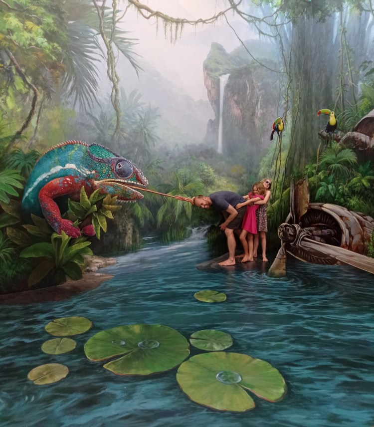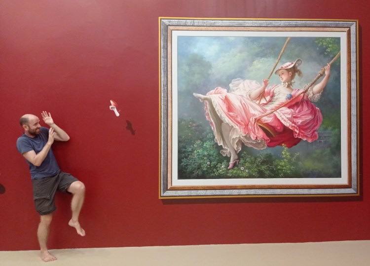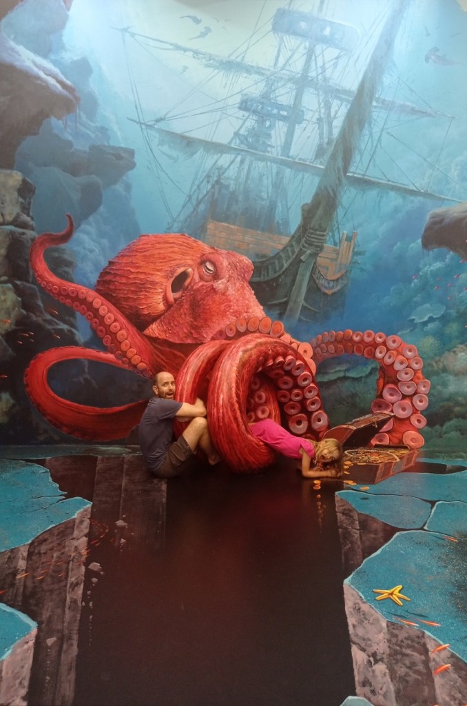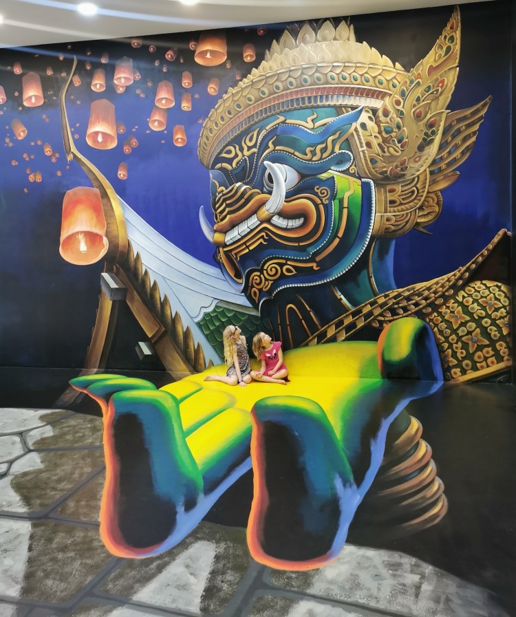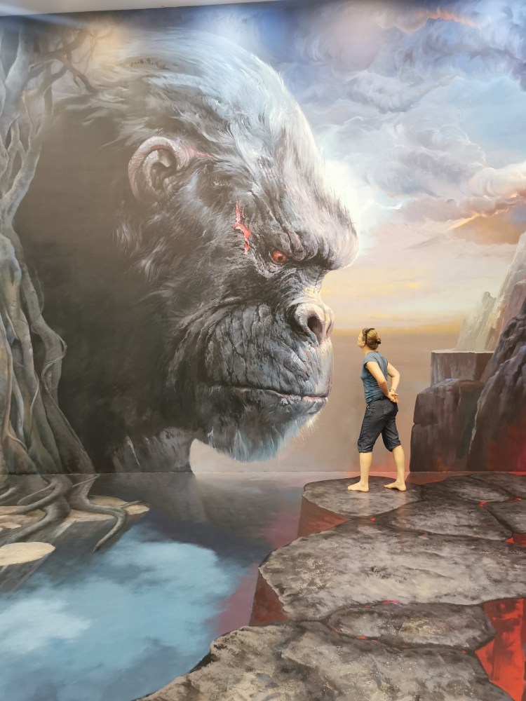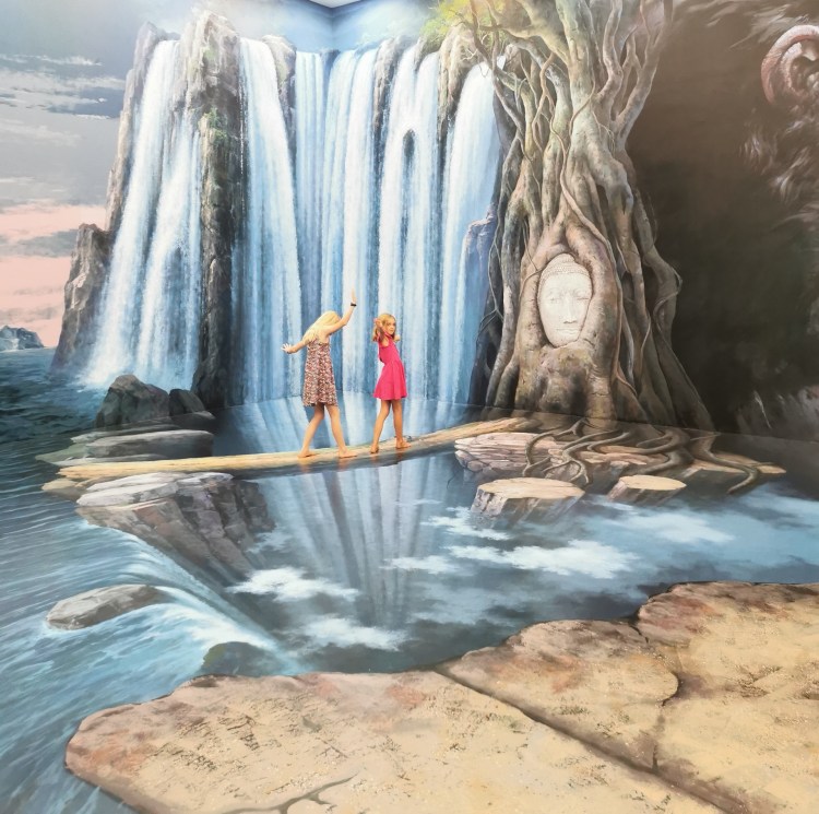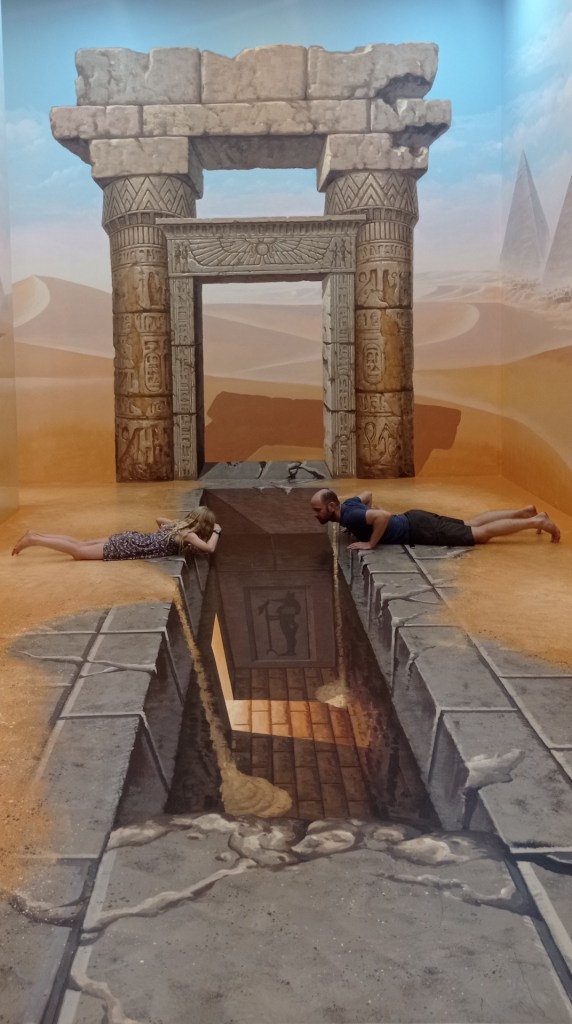Après cette visite, nous rentrons pour sûr dans le XXIe siècle: nous allons visiter le 3D Art museum. Ce sont des salles entièrement peintes afin de créer des illusions d’optique. Nous constatons rapidement que dans certaines salles, il est nécessaire de faire la photo pour que le cerveau « corrige » la 3D. Sur place, le cerveau ne fait pas bien la correction et nous ne voyons pas toujours l’effet d’optique. Nous y passons une bonne heure et demie de mises en scène et de rigolades 😃! Nous étions seuls la première heure, et une famille nous rejoint sur la fin… Il faut dire que nous profitons à fond de chaque salle 🤪.