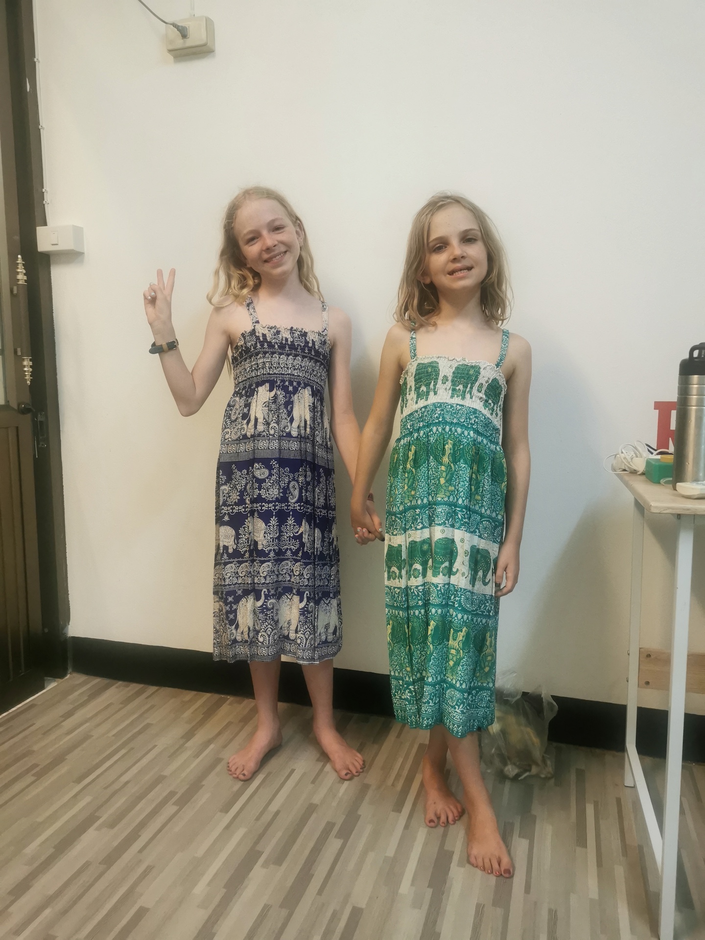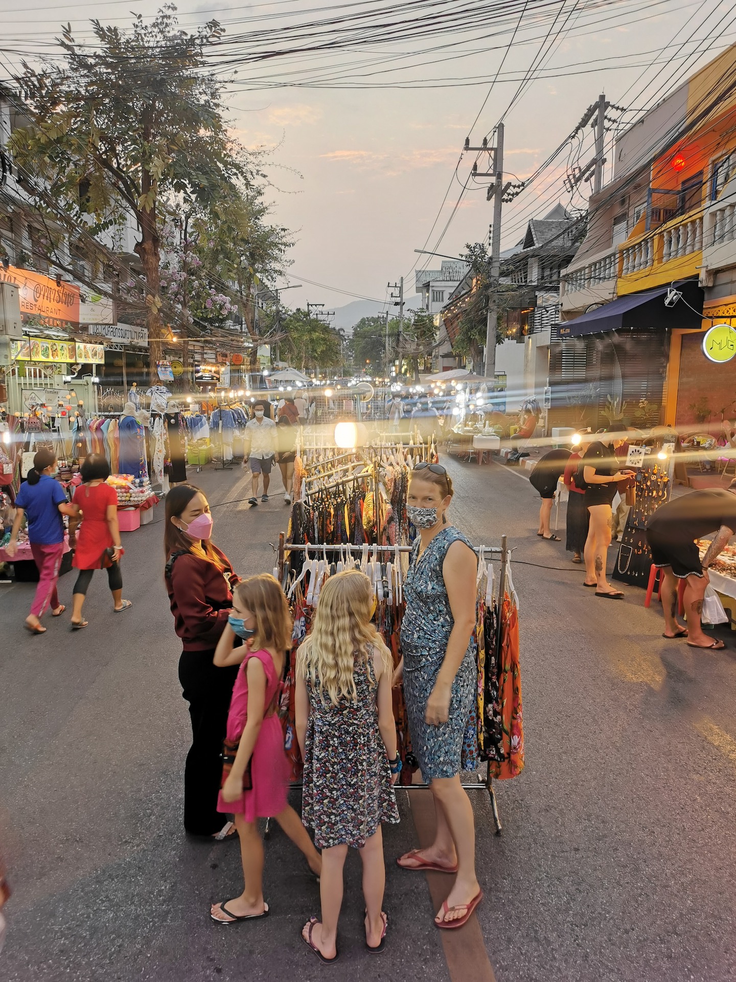 Le marché de nuit est immense et les étals remplissent les rues du quartier. Tout est piéton et bien bondé, malgré la diminution drastique des touristes depuis le Covid. Ce marché est très populaire et connu dans tout le pays car une des personnes rencontrées cet après-midi nous a dit être venu exprès à Chiang Mai pour venir acheter les cadeaux pour les invités du mariage de son fils. Notre visite a également un but commercial car les filles ont bien grandi depuis notre départ fin août et leur unique robe est devenue trop courte 🙃. Nous partons donc à la recherche de robes qui pourraient leur plaire. Après avoir déambulé dans de nombreuses rues (en essayant de ne pas passer deux fois dans la même), les filles trouvent leur bonheur et Gabrielle aussi 😉.